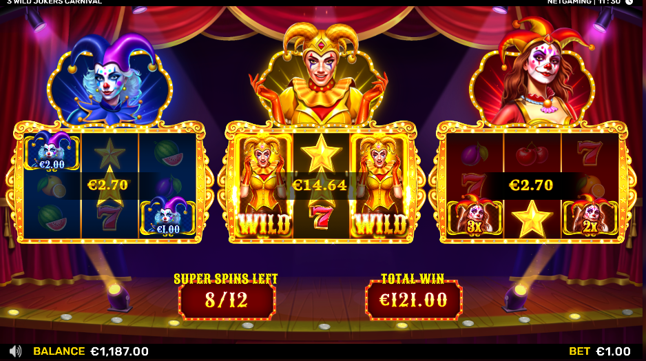 3 Wild Jokers Carnival is a bold and colourful evolution of the original game, offering nonstop entertainment and plenty of win potential through its unique multi-window Super Spins design. The combination of three distinct Wild types, escalating bonus stages, and the possibility of Wild abilities stacking creates an engaging rhythm that keeps the game feeling fresh and full of surprises.